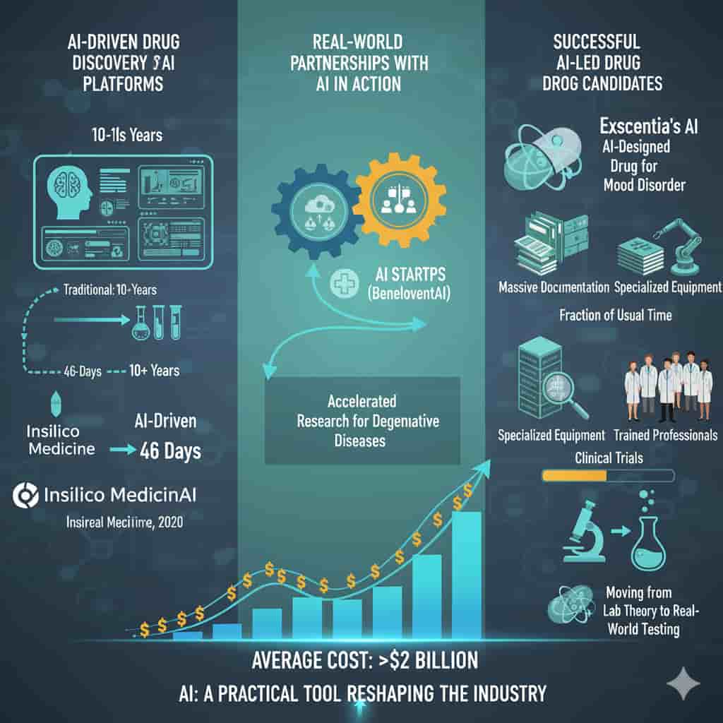 Companies like Insilico Medicine and Benevolent AI have built AI systems that generate new drug candidates in record time. In 2020, Insilico designed a novel Drug Development in just 46 days, a process that would typically take old age.