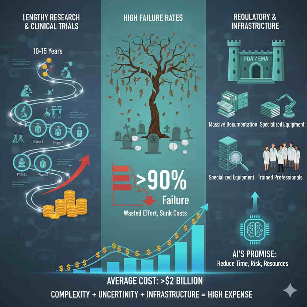 It often takes 10–15 years for a drug to move from early research to approval. Most of this time is spent in laboratory work and multi-phase clinical trials designed to prove both safety and effectiveness. Every extra year adds millions in costs.