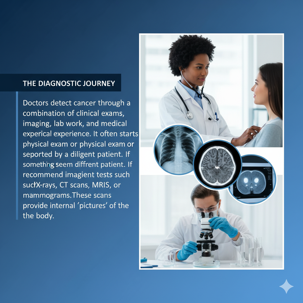 Doctors detect cancer through a combination of clinical exams, imaging, lab work, and medical experience. It often starts with a physical exam or symptoms reported by a diligent. If something seems different, doctors recommend imaging tests such as X-rays, CT scans, MRI s, or mammograms. These scans provide internal “pictures” of the body.