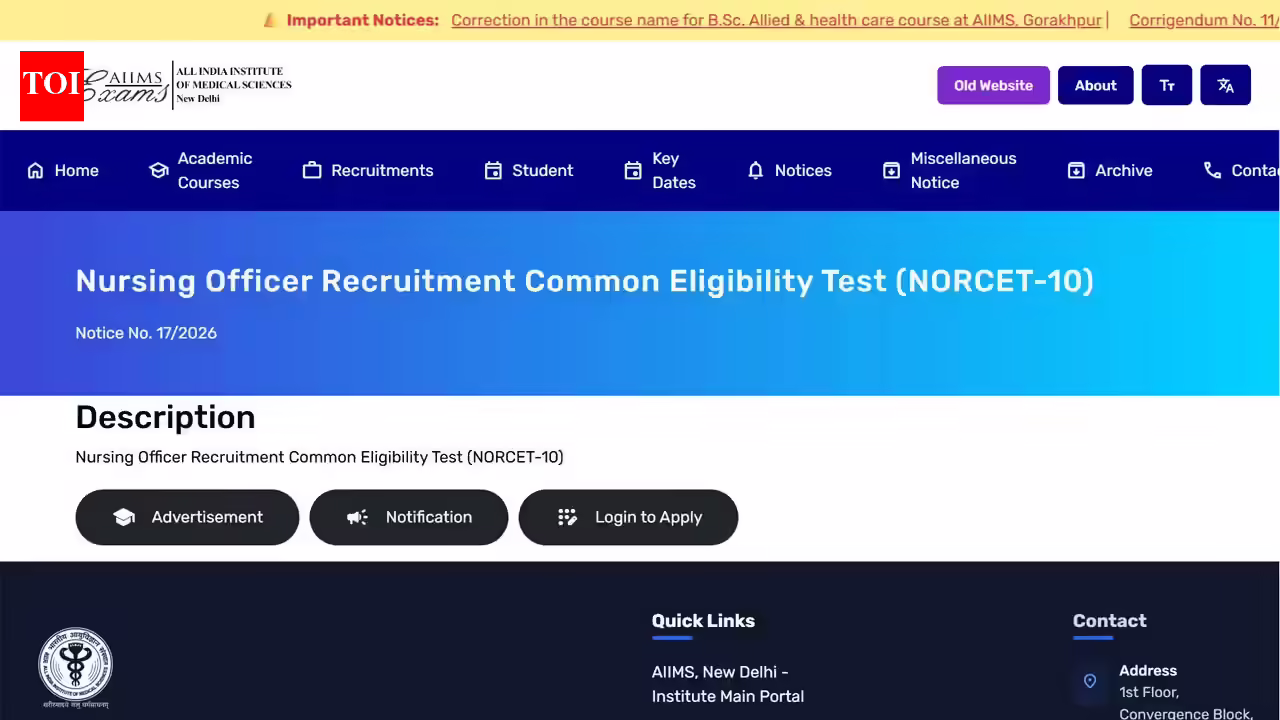 AIIMS NORCET 10 admit card 2026: The All India Institute of Medical Sciences (AIIMS) has released the exam city slip for the Nursing Officer Recruitment Common Eligibility Test (NORCET) 10 Stage I on April 4, 2026. The recruitment drive is being conducted for 2,551 Nursing Officer posts across AIIMS institutions.The students who have already enrolled themselves in the exam can find out their allotted cities before their preliminary test, which is due to take place on April 11, 2026. The admit card for the same exam will be available online at the official website, aiimsexams.ac.in, on April 8, 2026.Admit Card Issued Date and Exam ScheduleAccording to the official schedule, NORCET 10 Stage I exam will take place on April 11, 2026. The NORCET 10 Stage II exam will be conducted on April 30, 2026. The admit card for NORCET 10 Stage I exam will be released before the exam takes place, giving candidates enough time to get familiar with their exam details.For downloading the admit card, candidates will require logging into the official portal using their registration ID and password.Timeline and feesThe registration process for AIIMS NORCET 10 started from February 24, 2026, and ended on March 16, 2026. The deadline to pay the fee was also March 16, 2026.The application fees for candidates who are General or OBC are Rs 3,000 whereas candidates coming under SC, ST, and EWS pay Rs 2,400. Candidates with disabilities are exempt from paying the fees. Payment options include online payment by using a debit card, credit card, net banking or offline e-challan.Admit card download procedureIn order to get the admit card, candidates need to log into the official website, aiimsexams.ac.in, and then go to the admit card download link. They have to download the admit card and print a copy of it for future use.This card will be compulsory to show at the entrance to the examination hall. All candidates should ensure that all the information available on the admit card is correct.• AIIMS NORCET 10 exam city slip releasedOverview of Recruitment and its future stepsThe NORCET 10 recruitment process is designed to cover 2,551 positions for nursing officers in total. The recruitment process involves first stage I and then stage II mains examinations.No date for declaring the results has been finalized yet and it will be declared in due course of time. It is necessary for the candidates to visit the official examination website of AIIMS for the latest updates.