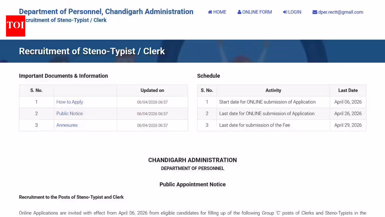 The Chandigarh Administration has announced recruitment for 257 posts, including Clerks and Steno-Typists, under the Group C ministerial cadre. The notification, issued on April 1, 2026, outlines regular appointments governed by the Chandigarh Administration (Clerk and Steno Typist) Recruitment Rules, 2026.Online applications opened on April 6, 2026, and the last date to submit forms is today, April 26, 2026. Candidates seeking to apply must complete the process through the official recruitment portal before the deadline. The last date for fee submission is April 29, 2026.Vacancy details and eligibility criteriaThe recruitment drive covers 234 Clerk posts and 23 Steno-Typist posts. Applicants must hold a graduate degree from a recognized university. For Clerk positions, English typing speed of 35 words per minute is required, while Steno-Typist applicants must have stenography speed of 80 words per minute.The age limit is set between 18 and 27 years, with April 26, 2026, as the cut-off date for calculation. Relaxation in the upper age limit will be provided as per applicable rules. Candidates must also possess an 80-hour Computer Course (CCC) certificate at the time of joining.Application fee and salary structureThe application fee is Rs 1000 for General, OBC and EWS categories, while SC, ESM and PWD candidates are required to pay Rs 500. Payment is to be made online.Selected candidates for Clerk posts will receive a pay scale of Rs 19,900 to Rs 63,200 under Level-2. Steno-Typists will be placed in Level-3 with a pay range of Rs 21,700 to Rs 69,100.Selection process and exam patternThe selection process includes a written examination, followed by a typing or skill test, document verification and a medical examination. The written test carries 200 marks and is conducted in two sessions.The morning session consists of English comprehension, general knowledge and computer proficiency, while the afternoon session covers mathematics, statistics and reasoning. Both sessions are objective and OMR-based, with no negative marking.The typing test is qualifying in nature. Final merit will be prepared based on marks obtained in the written examination.Steps to apply onlineCandidates must visit the official website, access the application link, fill in the required details, upload documents, pay the fee and submit the form. The detailed notification and application link have been available since April 6, 2026.