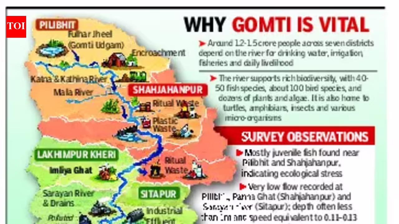 Lucknow: Gomti, the lifeline for 1.5 crore people and home to more than 200 species of flora and fauna, is slowly drying up due to multiple reasons, mostly caused by human activity and some natural factors, reveals a recent field survey by a team from Babasaheb Bhimrao Ambedkar University (BBAU).The survey covered the river’s origination point in Pilibhit and districts like Shahjahanpur, Lakhimpur Kheri, Sitapur and Hardoi through which it flows.In Pilibhit, about 15 km near the origin was found to be dry due to very low water at the source (Fulhar Jheel) and disruption of natural flow. The river’s flow was also slow across Pilibhit, Shahjahanpur, Lakhimpur Kheri and Sitapur.The river was found to be shallow and narrow at several stretches, leading to the spread of invasive plants like water hyacinth. Congress grass was also found in abundance along some banks, restricting natural vegetation growth.These conditions were seen at multiple locations, including near Fulhar Jheel (Madhotanda, Pilibhit), Triveni Ghat (Ghatampur), Panna Ghat (Shahjahanpur), Imliya Ghat (Lakhimpur Kheri) and stretches across Sitapur and Hardoi, where reduced flow and degraded banks have allowed invasive species to spread.Across these areas, clearing of natural vegetation, unprotected wetlands and encroachment through farming and construction along both banks were recorded, further weakening the river system.The survey also found that several tributaries of the Gomti are under stress. The Katna stream in Piparia Bhaja (Pilibhit) has become seasonal and remains almost dry or stagnant during non-monsoon months, while the Bhainsi river in Shahjahanpur often dries up in summer.The Kathina river near Sukatiya (Pilibhit-Lakhimpur Kheri stretch) shows reduced depth and slow flow due to encroachment and sand mining. Similarly, the Behta river in Hardoi has weakened flow due to land leveling for farming, indicating that many tributaries either carry very little water or face periodic drying.The survey further revealed that excessive groundwater abstractions near the river has caused irreversible damage to the baseflows resulting in loss of water in the river. There is a possibility of augmentation particularly at the Sharda canal bifurcation point in Puranpur (Madhotanda, Pilibhit) and through the Devipur minor near Fulhar Jheel. However, this water is not adequately returned during low-flow periods, reducing flow in downstream stretches across Lakhimpur Kheri, Sitapur and Hardoi.Pollution levels were found to be high at several locations along the Gomti. At Triveni Ghat (Ghatampur, Pilibhit) and Panna Ghat (Shahjahanpur), the river is polluted due to ritual waste, flowers, cloth and plastic dumping linked to religious activities.At Imliya Ghat (Lakhimpur Kheri), picnic and recreational waste, especially thermocol plates and single-use plastics, was observed along the banks.In Sitapur, the Sarayan river near Hargaon — a major tributary — is polluted by untreated wastewater from nearly 40 drains and discharge from a sugar mill, along with agricultural runoff, leading to algal growth.In Hardoi, the Sai river at Bhajehata showed fecal contamination due to open defecation.Across multiple stretches in Pilibhit, Shahjahanpur, Lakhimpur Kheri, Sitapur and Hardoi, domestic waste and plastic litter were also found along the riverbanks, largely due to poor waste management and low water flow, which reduces the river’s natural ability to clean itself.“Human behaviour, lack of coordination between authorities, and administrative negligence have all contributed to the present condition of the Gomti,” said Prof Venkatesh Dutta, head of the department of environmental science, who led the survey.He said the river can still be revived by ensuring minimum flow at the source at Fulhar Jheel. Researchers Rakesh Singh Kushwaha and Ankit Kumar added that at least 20 cusecs of water should be supplied from the Sharda canal system to sustain downstream flow.The team stressed protecting wetlands and natural drainage channels, removing encroachments and safeguarding riverbanks to support recovery. Prof Dutta said that low-cost, nature-based solutions can improve flow.“The condition of the Gomti is reversible, but only if timely and coordinated action is taken,” said researchers Komal Loshali, Pragati Sharma and Ayusma Yadav.