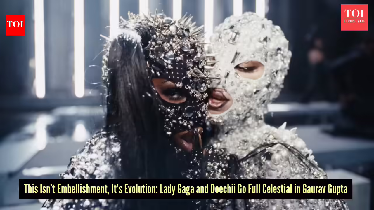 This fashion moment felt less red carpet and more like a celestial arrival, where popular global faces Lady Gaga and Doechii didn’t just show up but truly transcended it. Drenched in 3,000 crystals, what made their ensembles iconic was the vision brought by Indian designer Gaurav Gupta, who blurred the line between couture and cosmic fantasy.For the music video, Gaurav Gupta designed two heavy, embellished bodysuits, dipped in black and white crystals, respectively. Lady Gaga wore a pearl-toned corset-style bodysuit encrusted with crystals and pearls, whereas Doechii wore a black corset, layered with spikes and metal studs over sequins and crystal detailing.