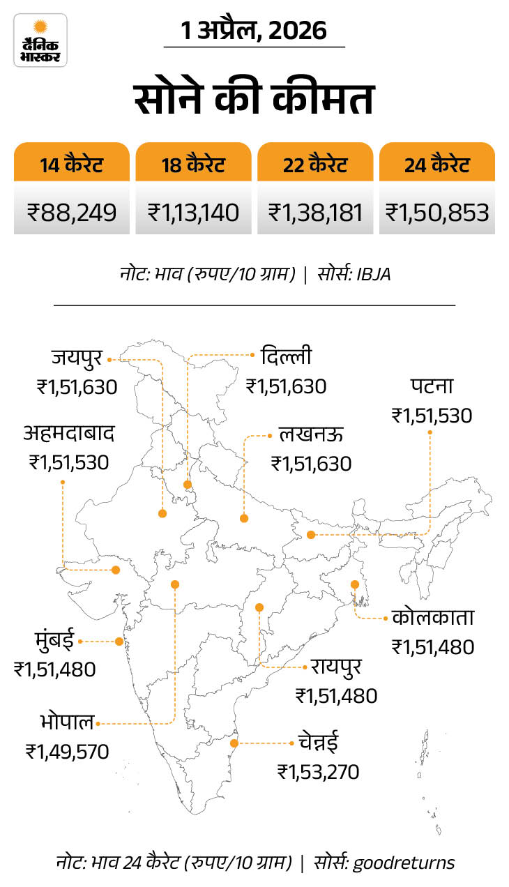 There was a rise in the prices of gold and silver today on April 1. According to India Bullion and Jewelers Association (IBJA), 10 grams of 24 carat gold has increased by Rs 4,120 to reach Rs 1.51 lakh. Earlier its price was Rs 1.47 lakh per 10 grams.
