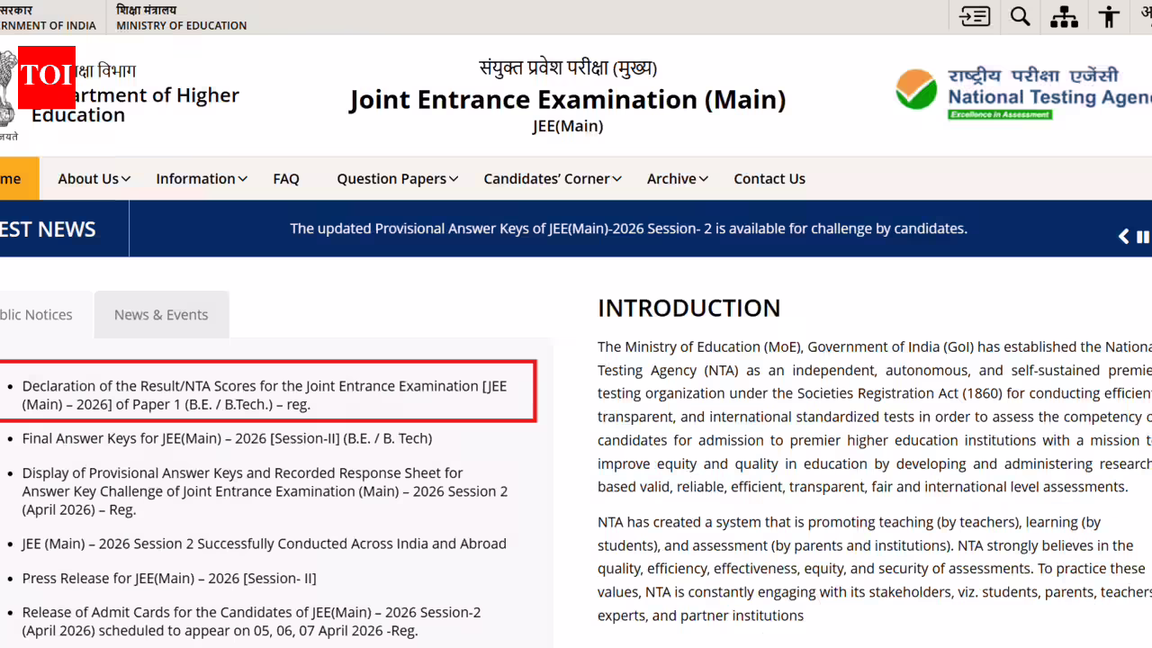 JEE Mains 2026 result: The National Testing Agency (NTA) has announced the results for the Joint Entrance Examination (JEE) Main 2026 Session 2 today, April 20, 2026. Candidates who appeared for the Bachelor of Engineering (BE) and Bachelor of Technology (B.Tech) papers can now check and download their scorecards from the official JEE Main website, which is jeemain.nta.nic.in.Around 11.23 lakh candidates have received their Session 2 scores and ranks. To access the result, candidates need to log in using their application number along with their password or date of birth.The NTA has also released the final answer key along with the results. Notably, two questions from the Physics section of the April 4 morning shift have been dropped.
