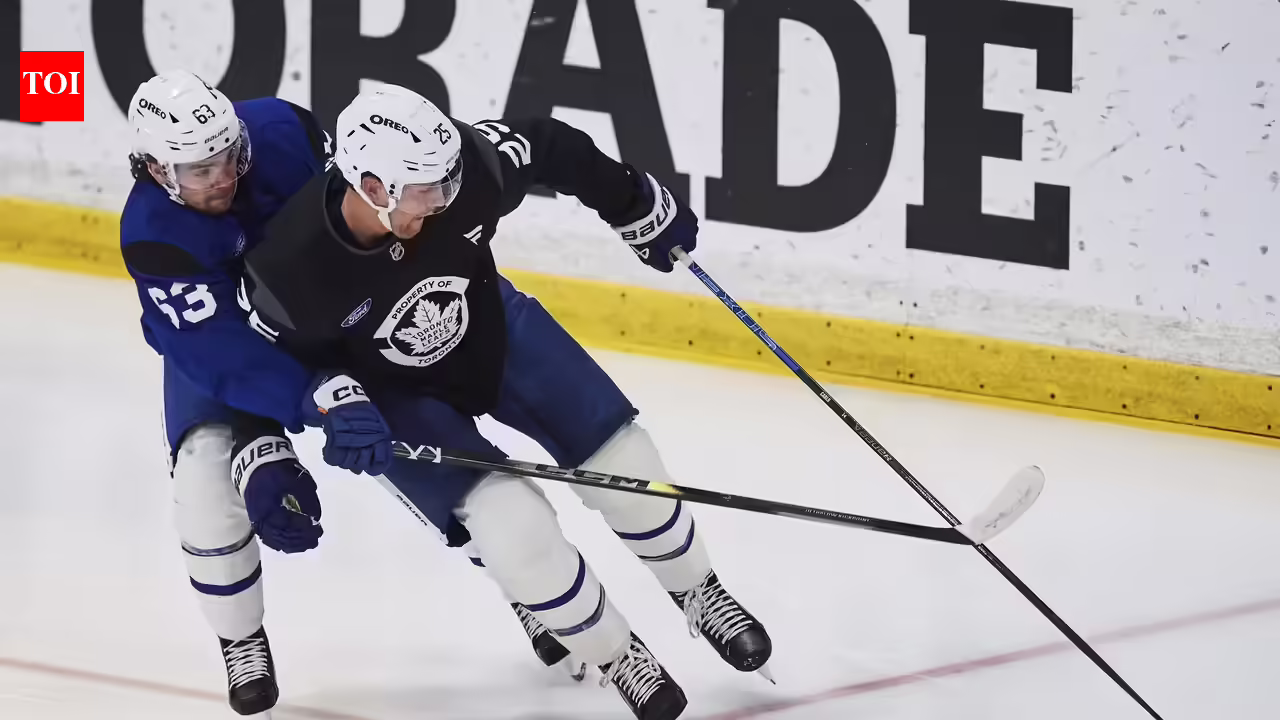 Toronto Maple Leafs defenseman Brandon Carlo (25) battles against Maple Leafs forward Matias Maccelli (63) during the opening week of the team’s NHL training camp … Read more