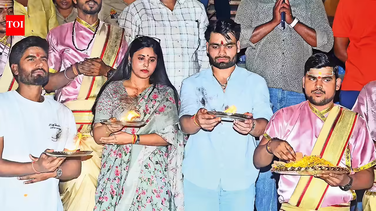 Cricketer Rinku Singh soaked in the spiritual essence of Varanasi as he visited the city on Tuesday. The left-handed middle-order batter was accompanied by his politico fiancée, Priya Saroj, as they visited Kashi Vishwanath Temple. Later in the evening, the couple proceeded to the Dashshwamedh Ghat to witness the iconic Ganga Aarti organized by Ganga Seva Nidhi. The captivating ceremony, marked by synchronized chants, rhythmic bells, and the glow of oil lamps, left the duo visibly captivated. Eyewitnesses noted that Rinku Singh spent time soaking in the spiritual ambience. The couple also performed a puja by making offerings to the river Ganga. The president of Ganga Seva Nidhi, Sushant Mishra, honored him with a memento and prasad.